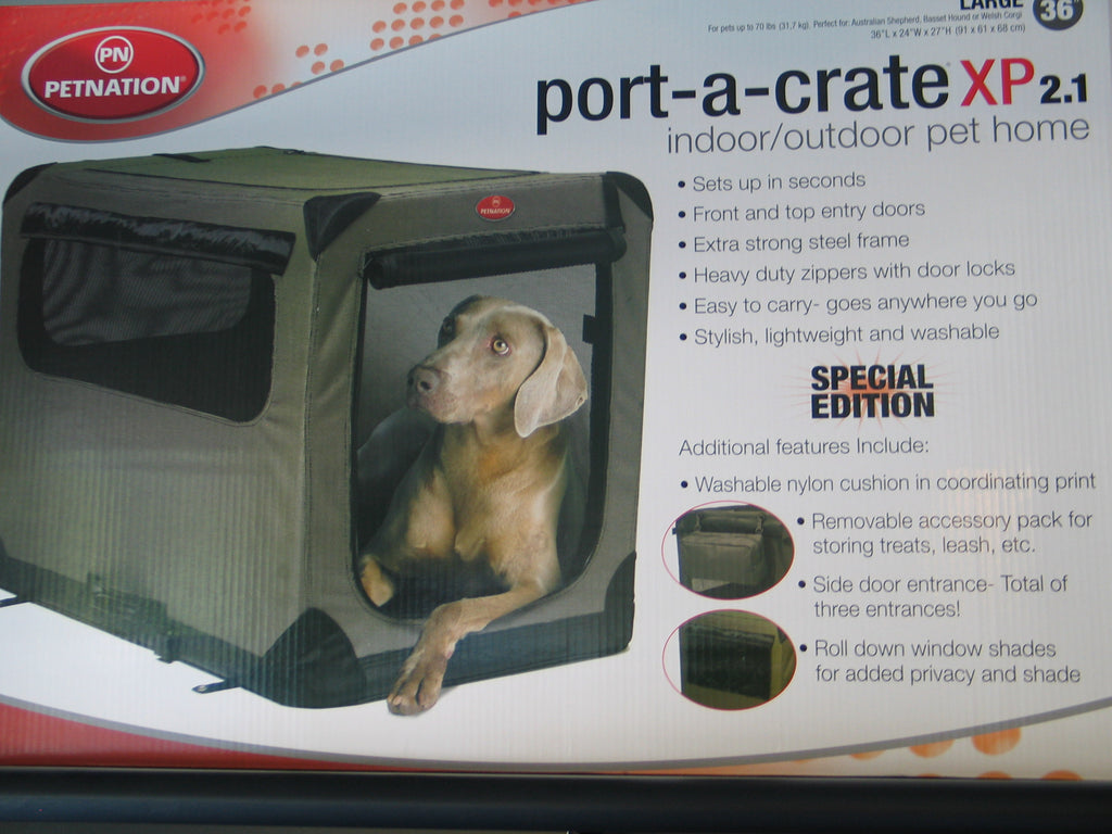 porte-a-crate XP 2.1 • For pets upto 70lbs • Perfect for Australian Shephered, Bassett Hound, Welsh Corgi and many other breeds • 36" x 24" x 27" (91 x 61 x 68 cms)porte-a-crate XP 2.1 • indoor/oudoor pet home • Sets up in seconds • Front & top entry doors • Extra strong steel frame • Heavy duty zippers with door locks • Easy to carry - goes anywhere you go • Stylish lightweight washable • • • Special Addition - Includes • • • • Washable nylon cushion in co-ordinating print • Side door entrace - total of 3 entrances • Roll down window shades for added privacy & shade