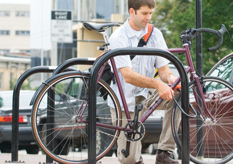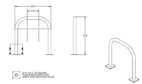 Flange Mount • Park upto 2 Bikes • Installed Dimensions 30" x 6" x 32" • Footprint with Bikes 68" x 110" • Weight 30 lbs. • Saris Commercial grade racks are constructed from ASTM A513 structural steel. • Double coat polyester TGIC coated Stocked color is black Listed colors available at no extra charge Hot dipped galvanized finish available after fabrication Call for availability of other custom finishes. • Custom Powder Coat Finishes • Call for available custom finishes. • Saris racks are available in several colors to complement any project. • Many additional designer colors available. Contact us for details. • Click on Product Catalogue for Product SpecificationsStyle Strength Utility with Simplicity Combined All in One Bike Rack • Inverted-U Style accomodates two bikes. • Heavy duty, 2 3/8” outer diameter, 9 gauge schedule 40 pipe. • Finished in double-coat polyester TGIC coating. Standard color black. • A generic image of the product may have been used. • Click on Product Catalogue for Product Specifications.