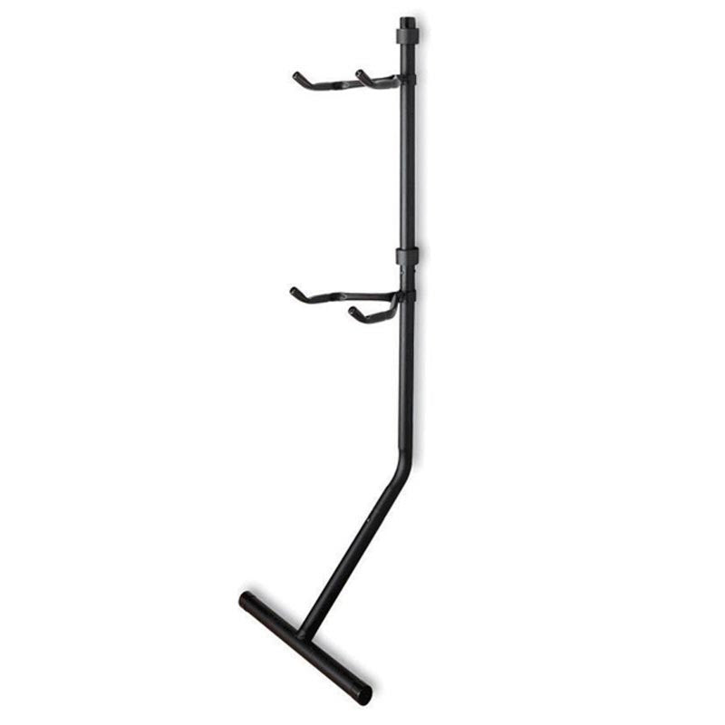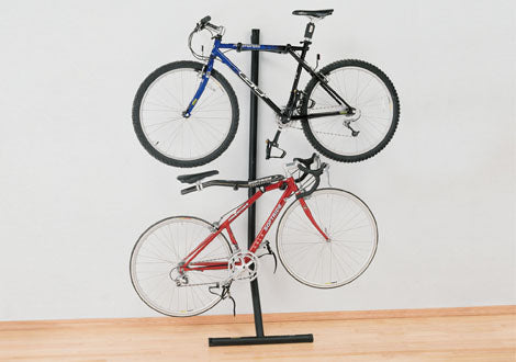 Adjustable arms move up and down to fit different size bike frames. • Sleeves on arms hold and protect frames. • Cushioned pads protect floors and walls. • No permanent mounting required. • Adjustable arms move up and down to fit different size bike frames. • Sleeves on arms hold and protect frames. • Cushioned pads protect floors and walls. • No permanent mounting required.