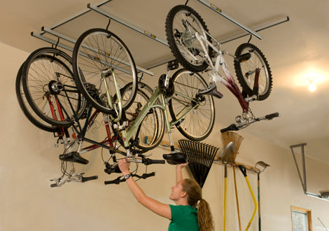 Specifications • Free up floor space in your garage or basement. • Gives individual access to each bike without having to remove adjacent bkes while offering compact storage. • Wheel hooks adjust to the bicycle wheel base to accommodate a wide range of bicycle sizes. • Allows access and compact storage of additional 2 bikes to a total of 6 bikes (50 lbs./bike). Space Saving Design •2-Bike Add-On Kit for Saris CycleGlide • Increase bike storage capacity of 4-Bike CycleGlide rack to accommodate 6 bikes. • Space saving ceiling mounted. • Patented glider design. • Adjustable bike trays.