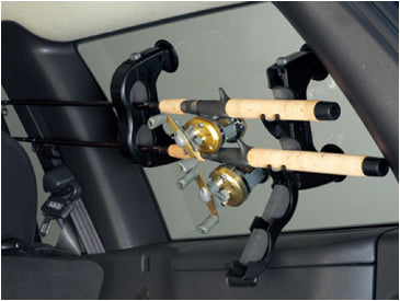2 Rods Quick and easy solution for carrying your rods. Suction cups attach to inside rear side windows. Clamp has rubber cradles and push button opening.
